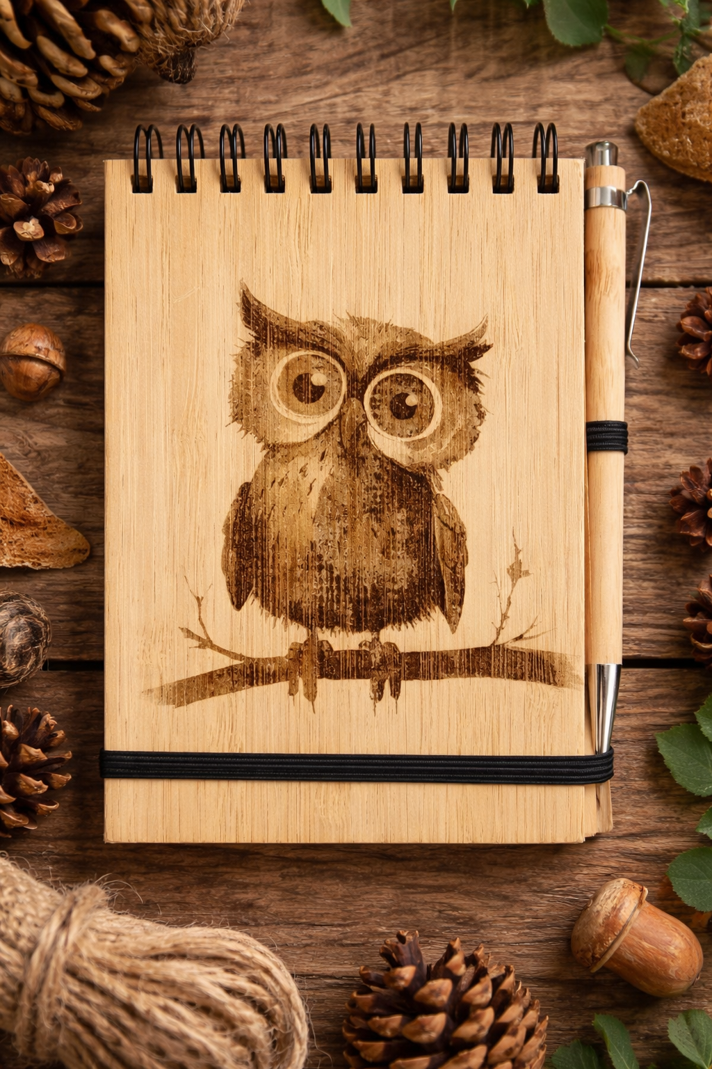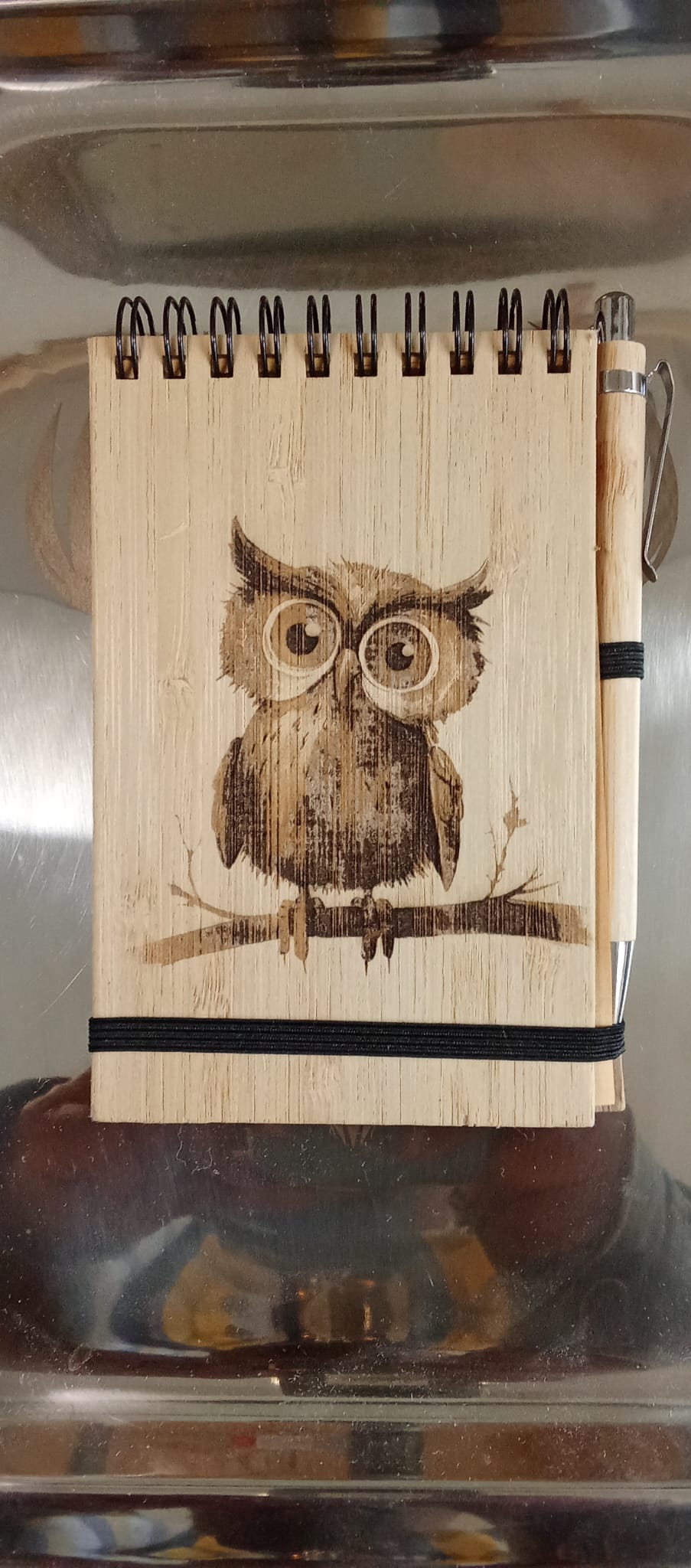 Carnet A6 en contreplaqué de bambou gravé – Chouette
