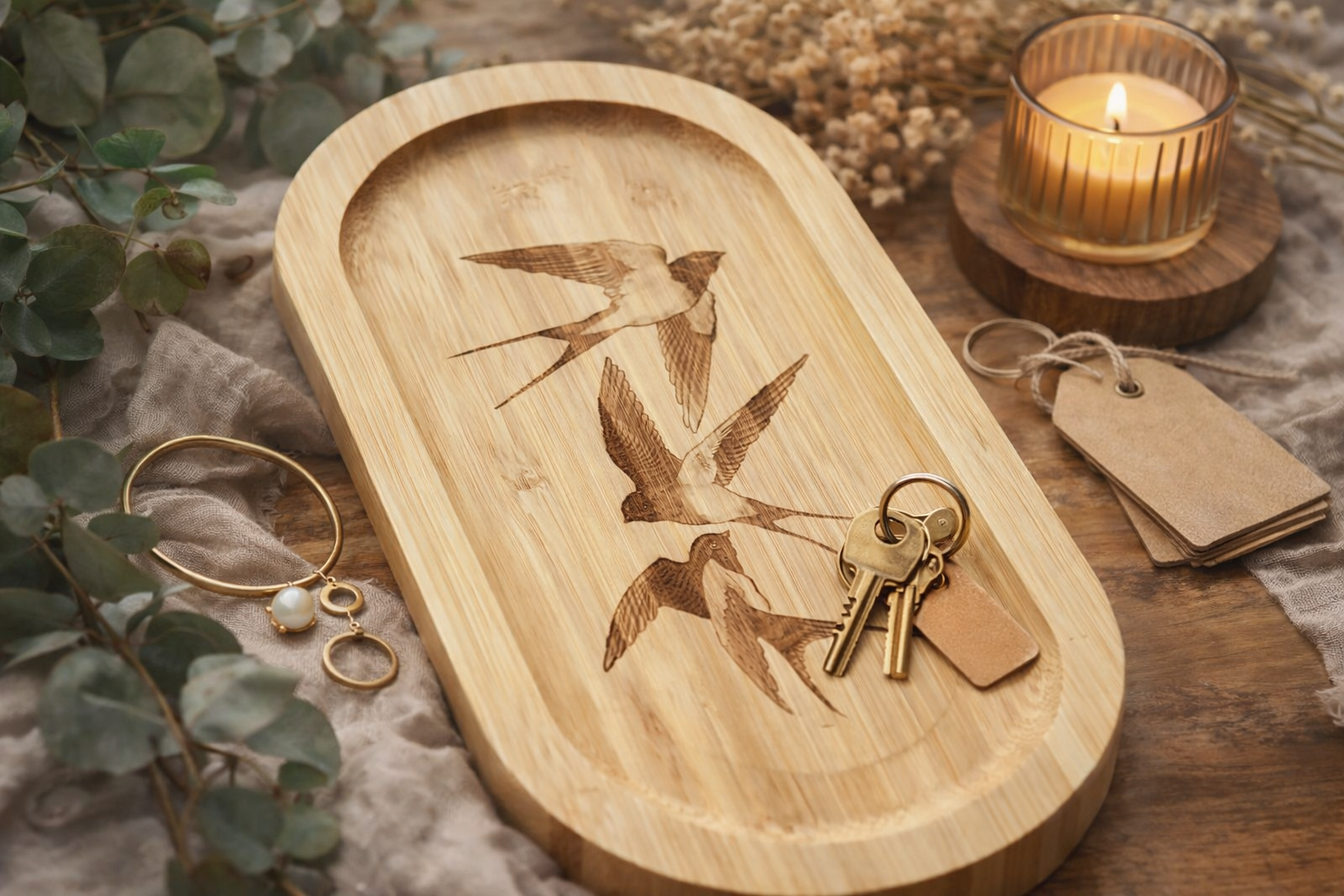 Laisse entrer un souffle de légèreté dans ton intérieur avec Valse d’hirondelles, un vide-poche en bambou gravé où trois hirondelles semblent danser dans le ciel.